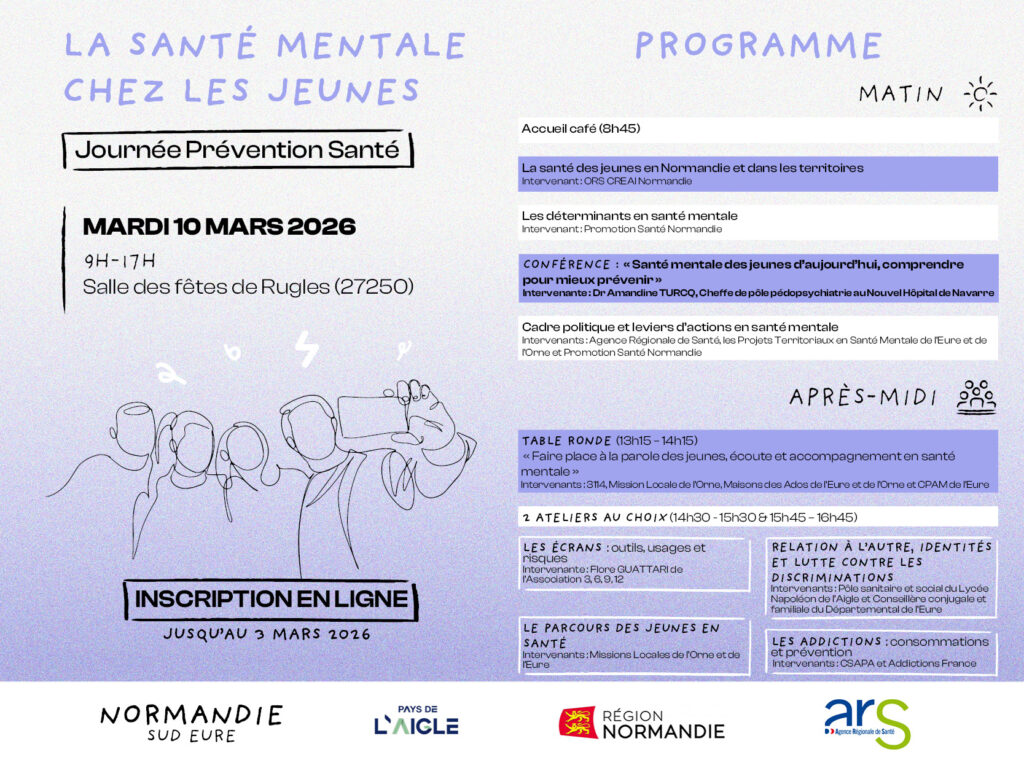 Dans le cadre de la Grande Cause Nationale 2025-2026, la MJC récemment labellisée Maison Sport Santé va participer à la journée de prévention consacrée à la santé mentale des jeunes. Une journée co-organisée par Normandie Sud Eure et les Pays de l’Aigle et à destination des professionnels de l’éducation, du social, du médico-social et de la santé.